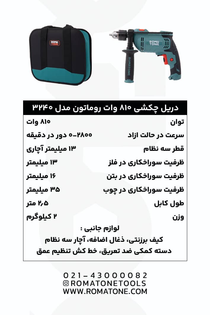 مدل 3240 از دریل روماتون با توجه به توان موتور 810 وات و سرعت 2800 دور در دقیقه، به عنوان یک ابزار کارآمد برای کارهای ساخت و ساز معرفی شده است. این دستگاه با قابلیت سوراخکاری در فلز تا 13 میلیمتر و در بتن 16 میلیمتر و در چوب تا 35 میلیمتر، نیازهای گوناگون کاربران را برآورده میکند.